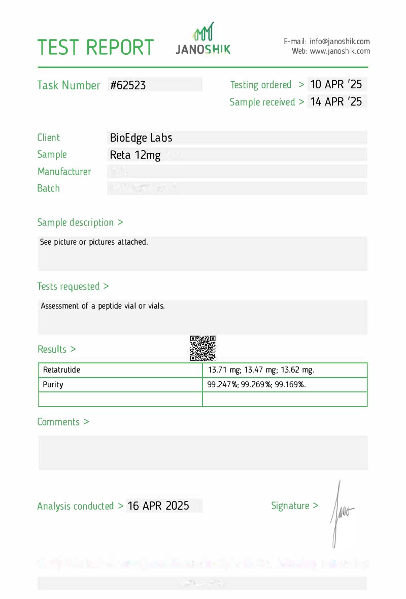 Retatrutide (R-GLP-3) is supplied by BioEdge Research Labs exclusively for laboratory testing and in vitro research.