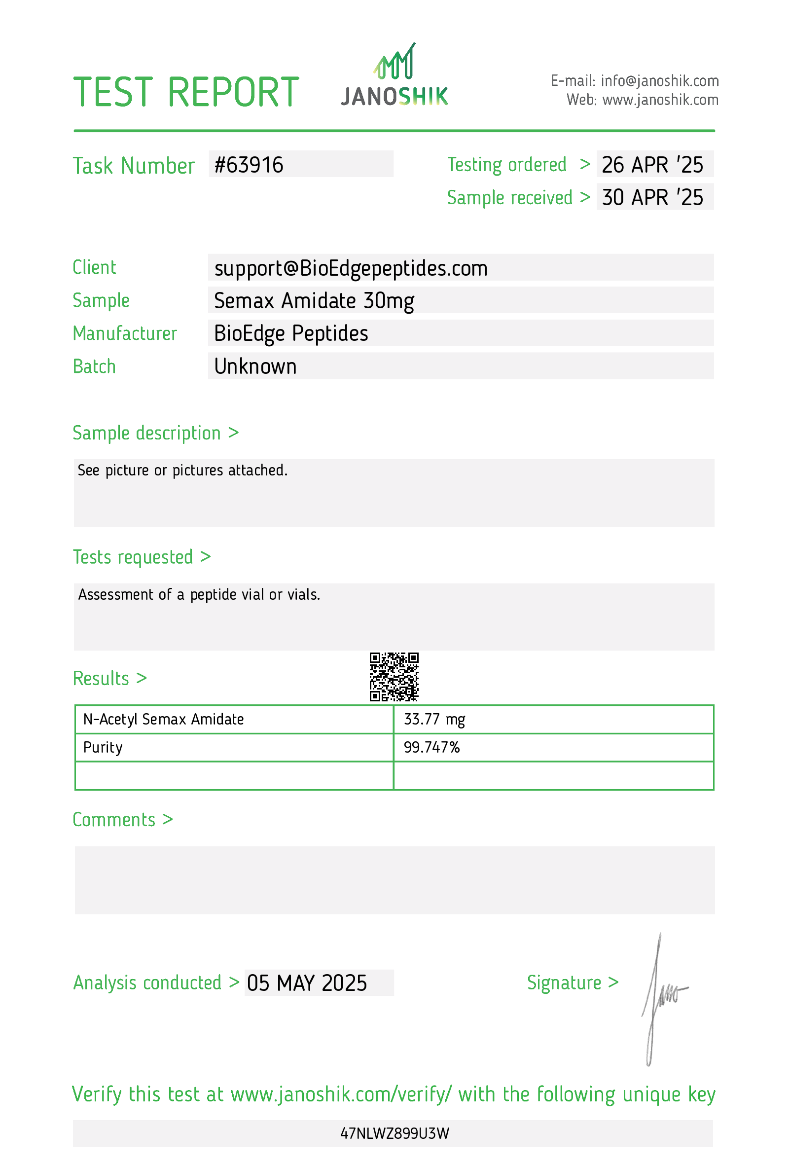 At BioEdge, we are committed to providing research professionals with the highest quality peptides on the market. Every compound we supply is manufactured in a cGMP-certified facility, undergoes rigorous third-party testing, and is intended strictly for in vitro or laboratory research use only.